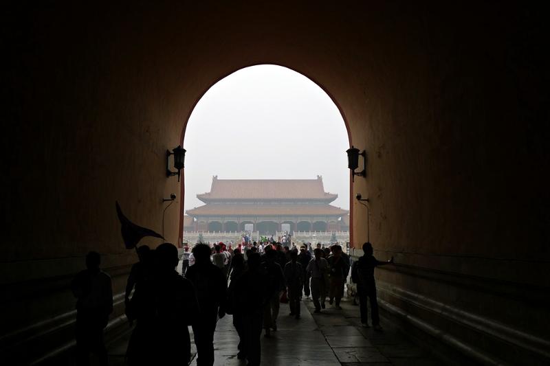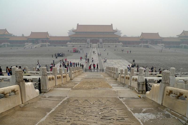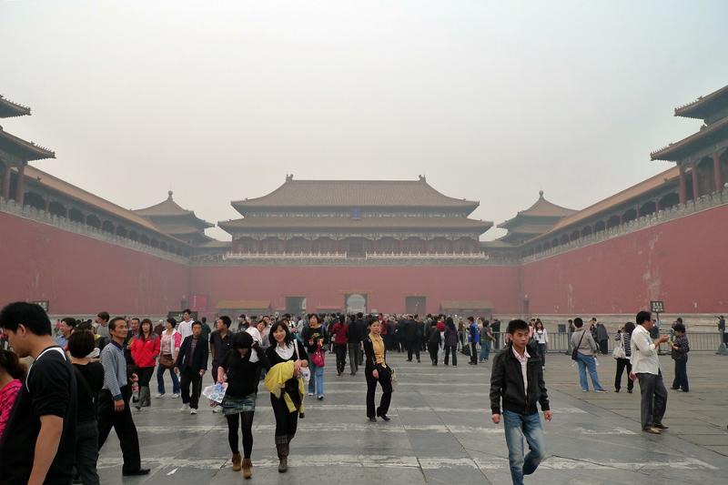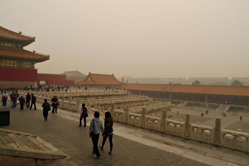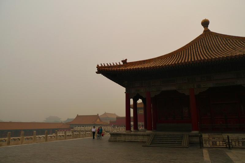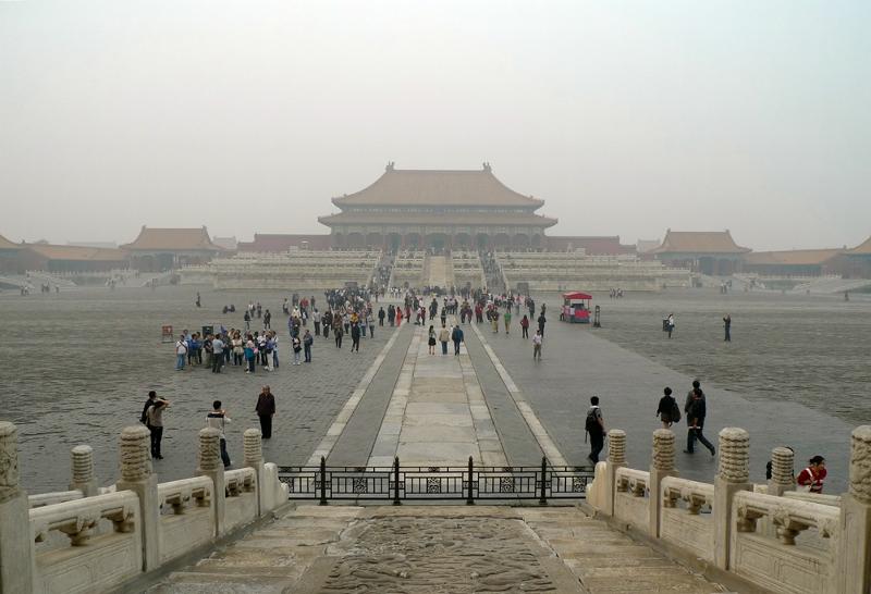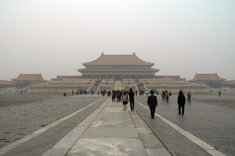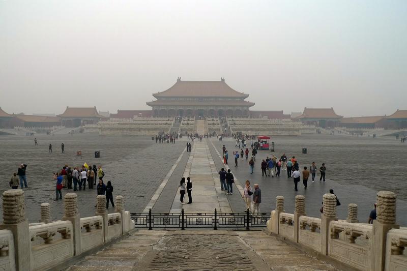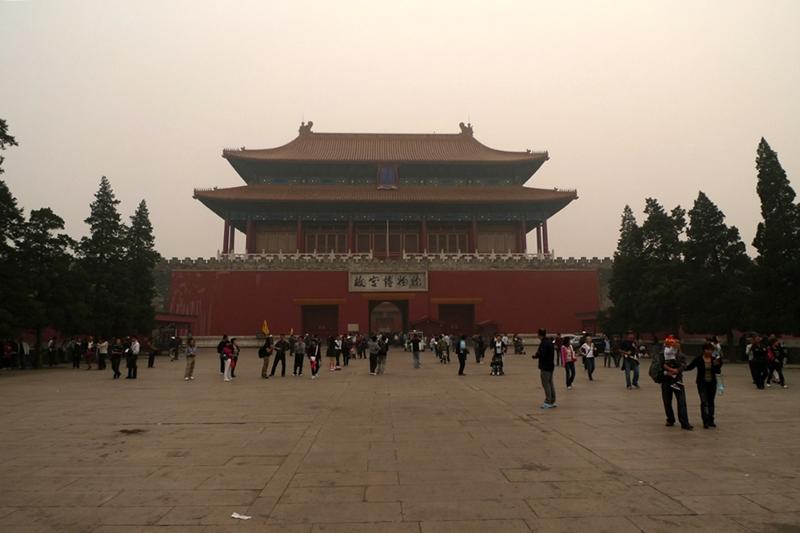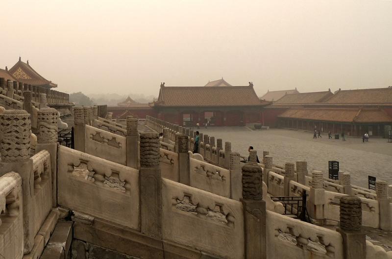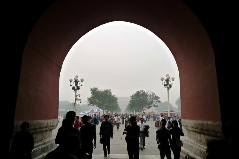 이제 자금성의 첫 관문인 천안문이 보인다. 베이징의 악명 높은 안개는 낮이 되어도 가실 줄을 모른다. 흙먼지와 매연이 뒤섞여 도시 전체가 희미하게 가려진다. 그리 멀지 않은 천안문이 희뿌옇게 보일 정도다.