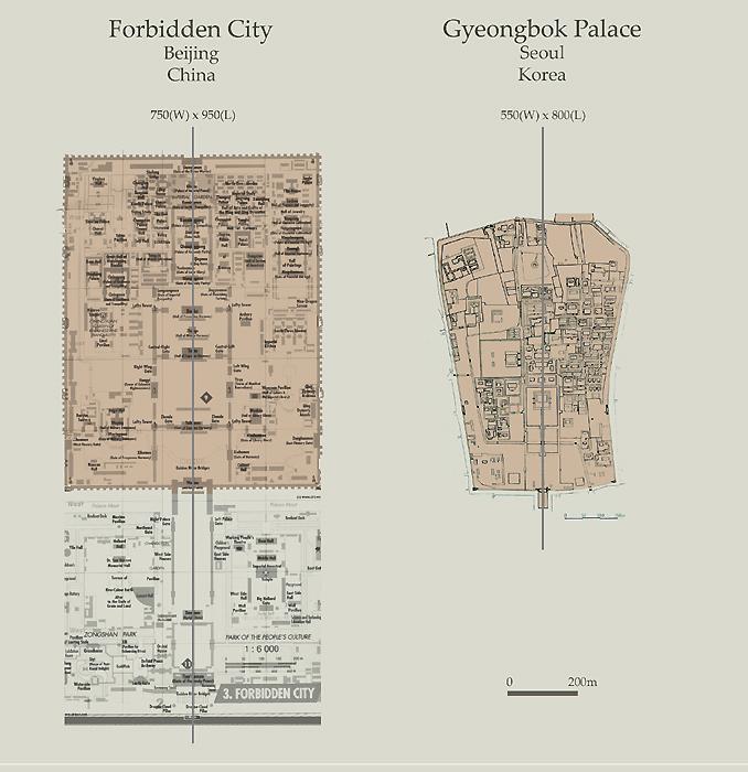 실제 경복궁과 자금성의 크기가 얼마 정도인지 대비시켜보는 자료다.